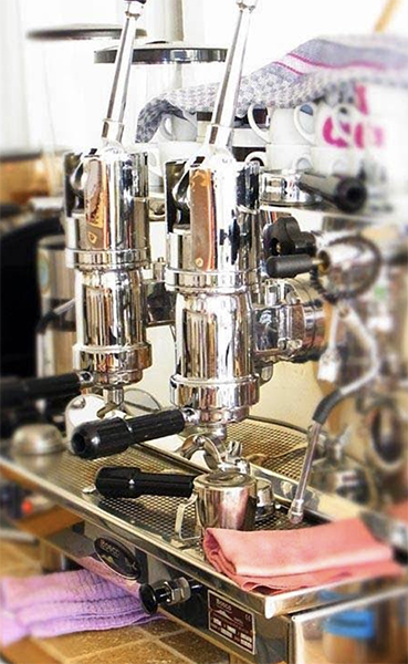 Alle Kaffeegetränke werden auf einer zweigruppigen Handhebelmaschine zubereitet, einer Bosco Sorrento, die in der kleinen neapolitanischen Manufaktur von Attilio Bosco in Handarbeit angefertigt wurde.